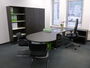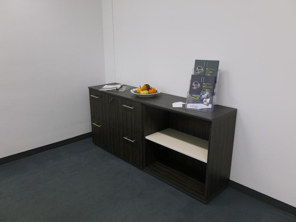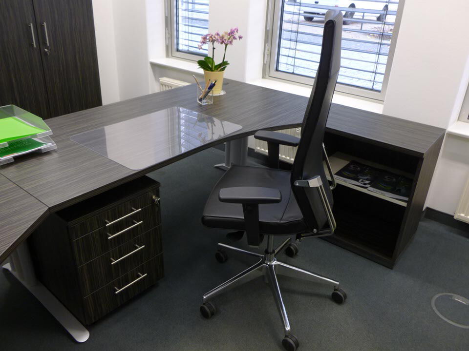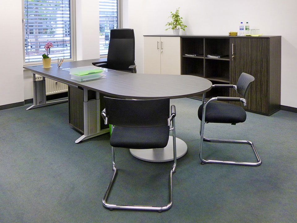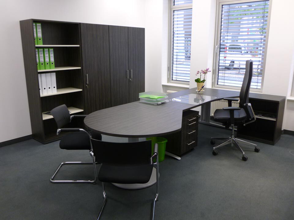 Der Schreibtisch mit gerundetem Beratungsansatz bietet ausreichend Arbeitsfläche. Das Beistellregal wie auch der Rollcontainer bieten genügend Stauraum in Tischnähe. Die Büroschränke sind auf die individuellen Wünsche abgestimmt und bieten Platz für Ordner, Hängeregistraturen und Stauraum für die Garderobe. Durch die dunkle Holzoptik wirkt das Büro elegant und zeitlos.