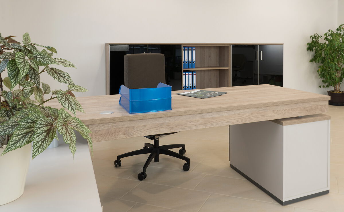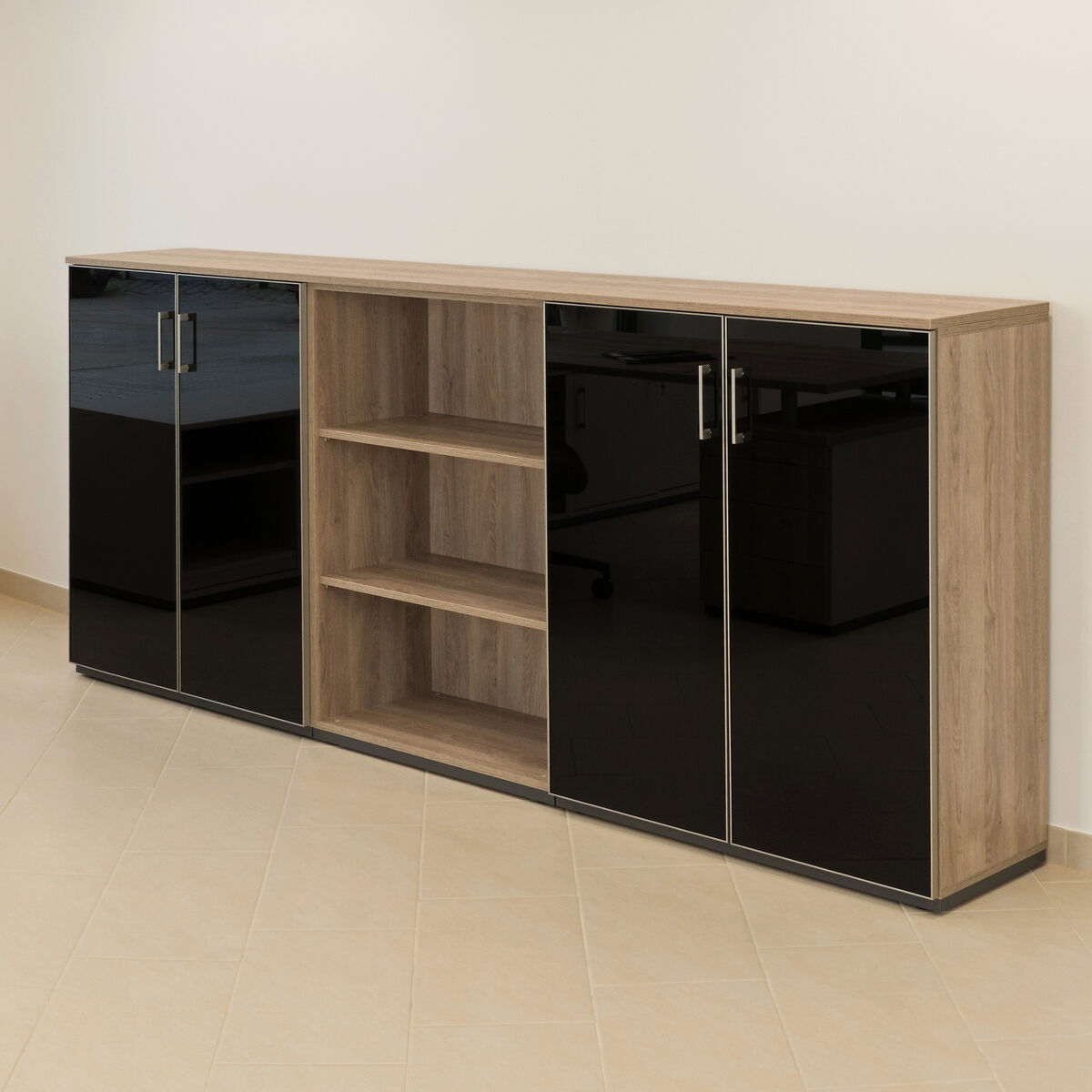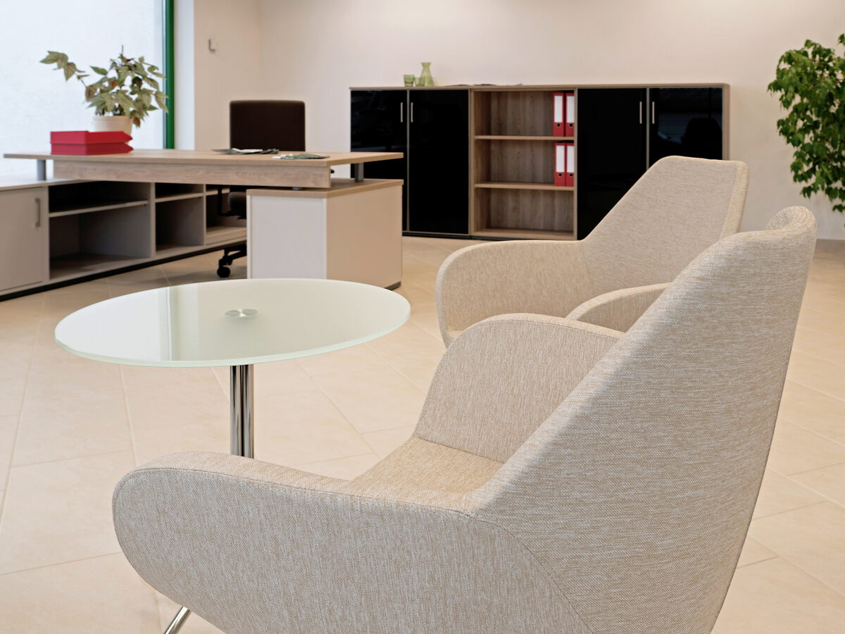 Moderne Schreibtischkombination in Eiche mit sanftem Grauton. Dazu ein passendes Sideboard mit schwarzen Glastüren. Die gemütliche Sitzecke mit Glastisch und Besuchersesseln runden das Gesamtbild ab.