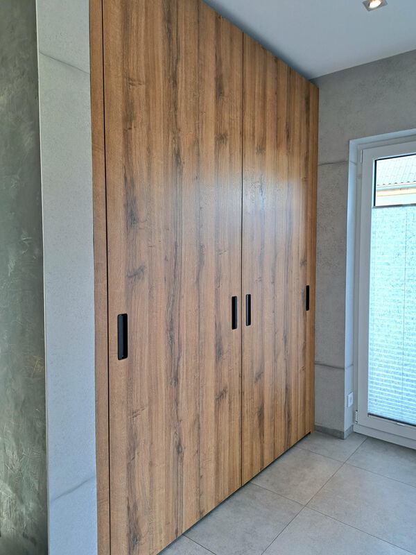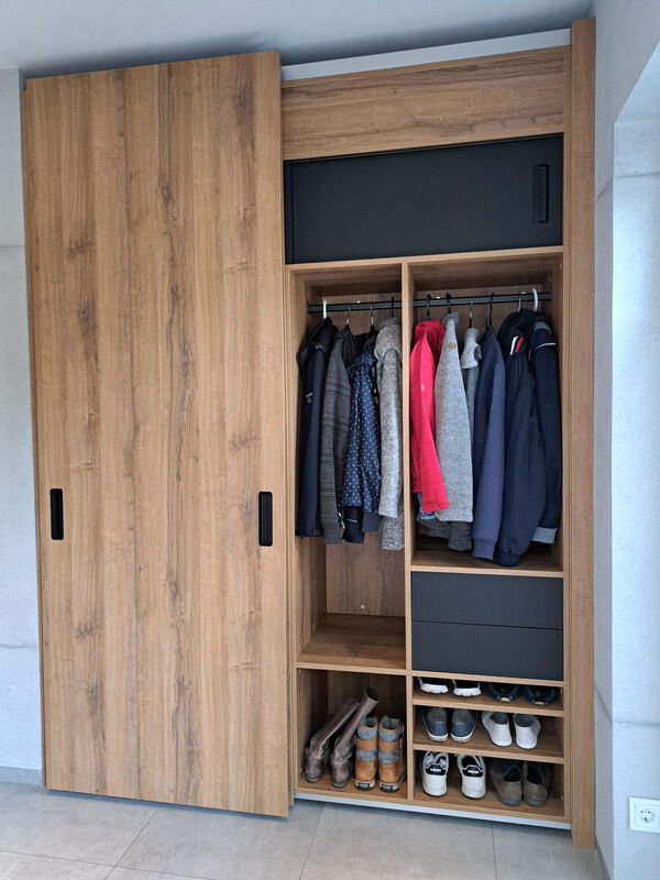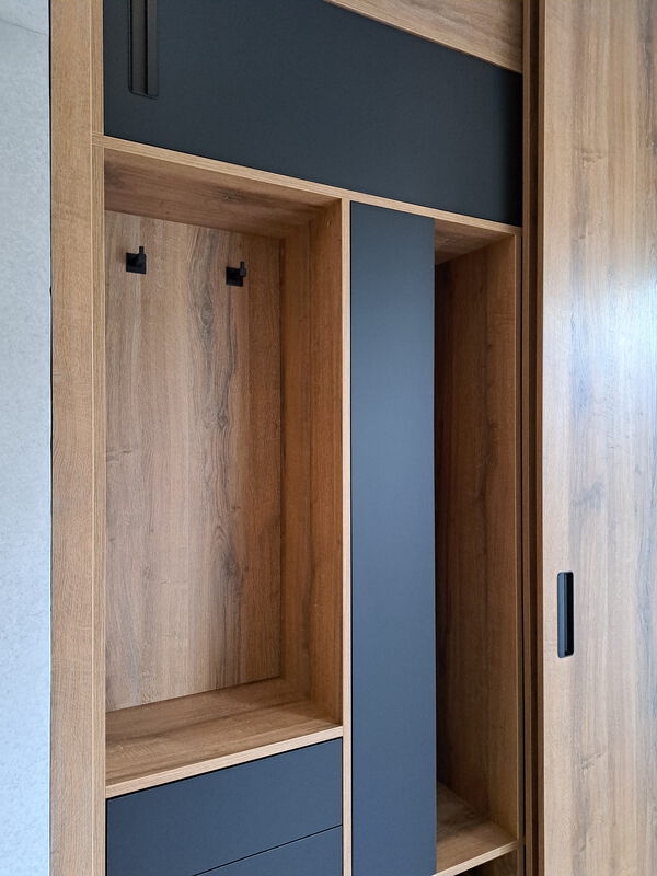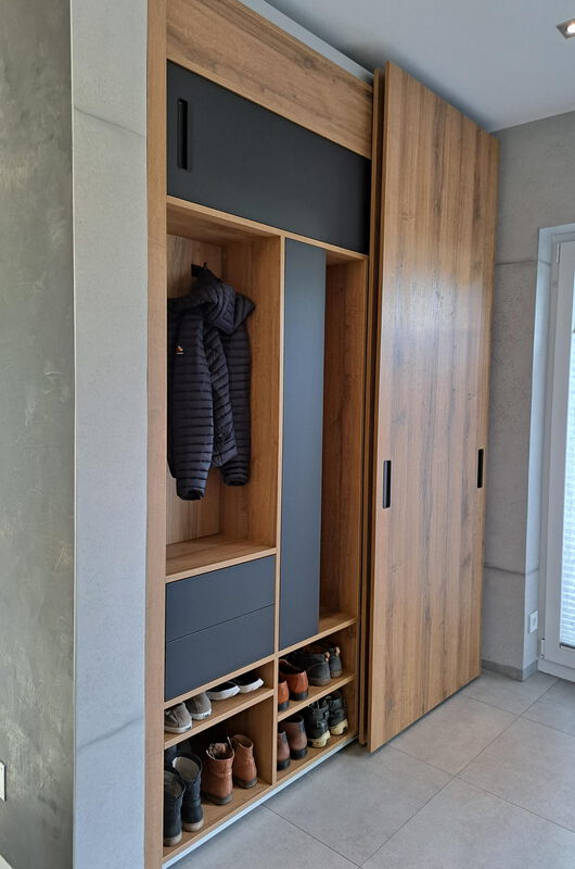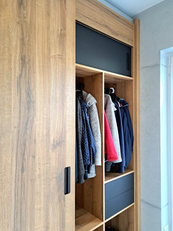 Ein kleines Raumwunder ist diese Einbaugarderobe. Vorborgen hinter großzügigen Schiebetüren bietet sie Stauraum für Schuhe, Jacken und Mäntel. Die grifflosen Schubkästen öffnen sich per TipOn - Mechanik und bieten Platz für kleinere Gebrauchsgegenstände. Rustikale Eiche trifft auf elegantes mattes Schwarz und vermittelt eine moderne Eleganz, die hervorragend mit der Betonoptik der Wände harmoniert.