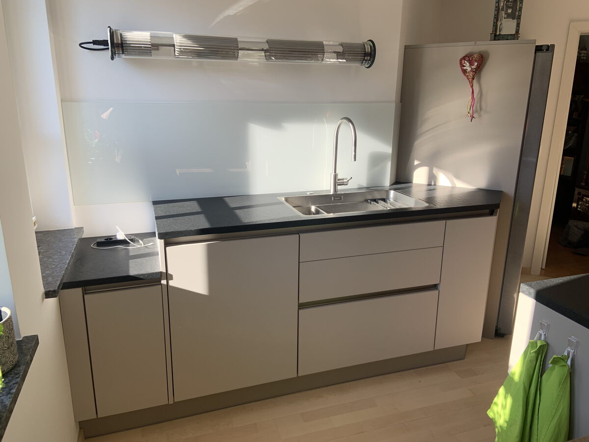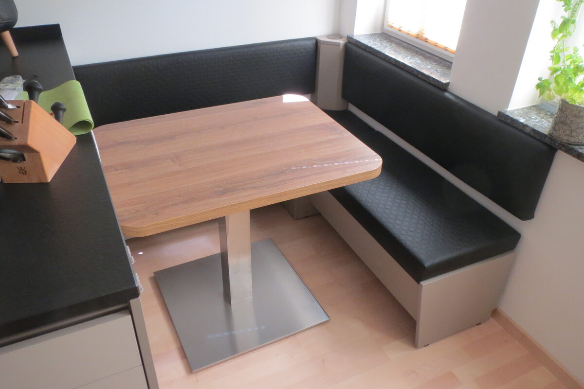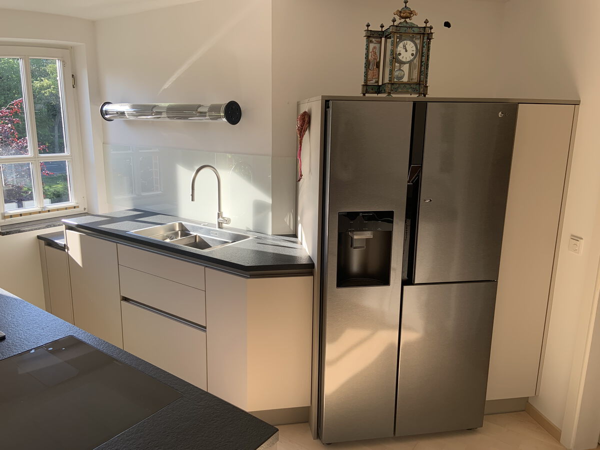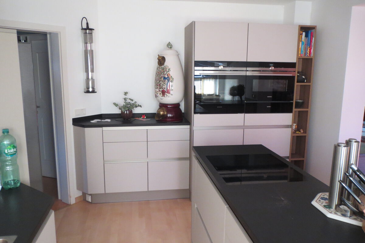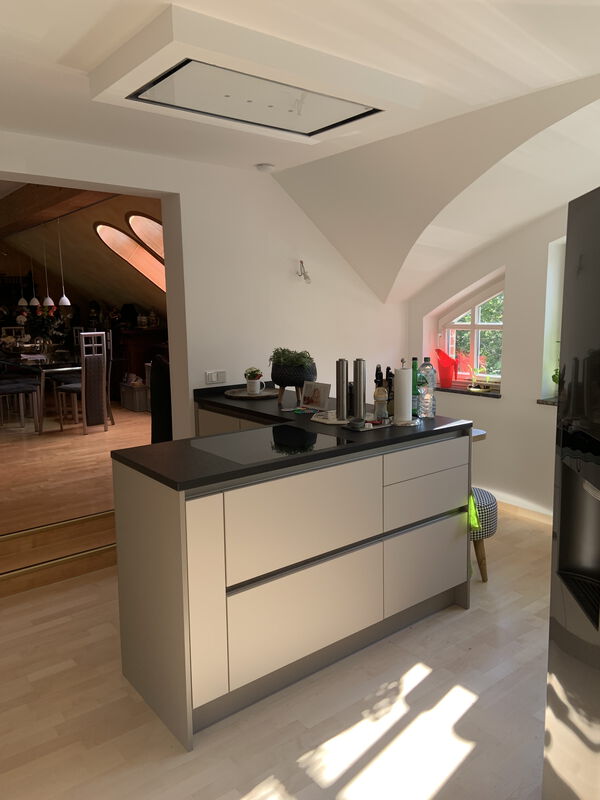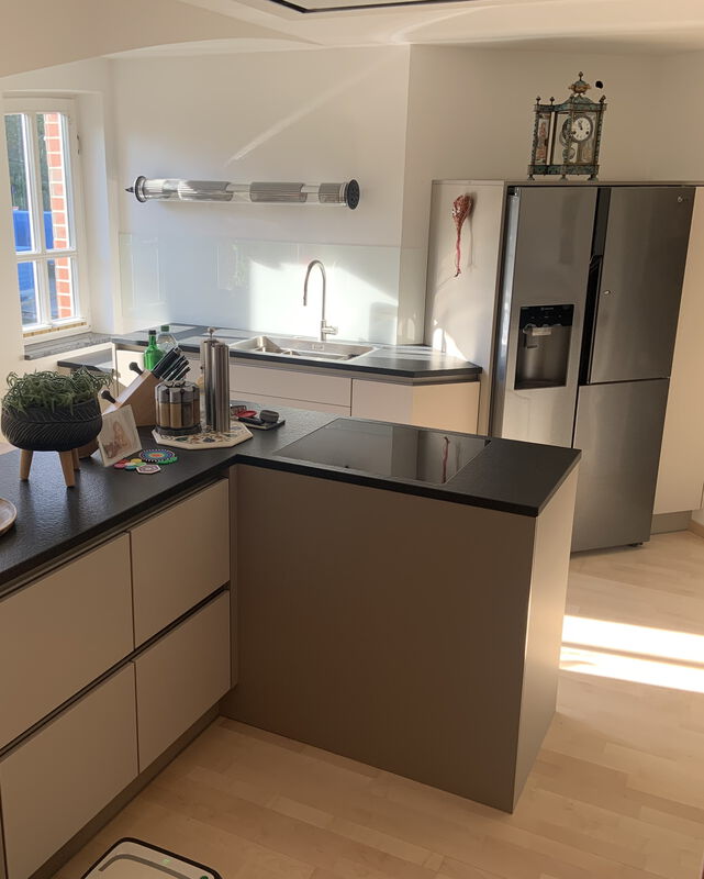 Modern, zeitlos und elegant präsentiert sich diese Küche mit sanften Grautönen. Herzstück der Küche ist die Insel in L-Form, die mehrere Funktionen miteinander verbindet. Sie bietet genügend Stauraum für alles nötige. Die Granitarbeitsplatte ist nicht nur hitzebeständig, sie verspricht auch ein hygienisches Kochen. Neben dem Kochfeld bietet sie genügend Platz zum Vorbereiten. Außerdem trennt die Insel den Essbereich elegant ab und schafft dadurch eine Ruhezone im sonst belebten Raum. Die Eckbank ist eine Sonderanfertigung mit Stauraum unter der Sitzfläche und integrierter Steckdose in der Rückenlehne. Das Spülbecken ist großzügig dimensioniert und pflegeleicht. Der hocheingebaute Backofen mit Wärmeschublade und die Mikrowelle ermöglichen ein ergonomischen Arbeiten auf Augenhöhe.