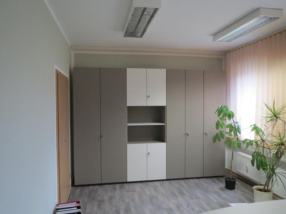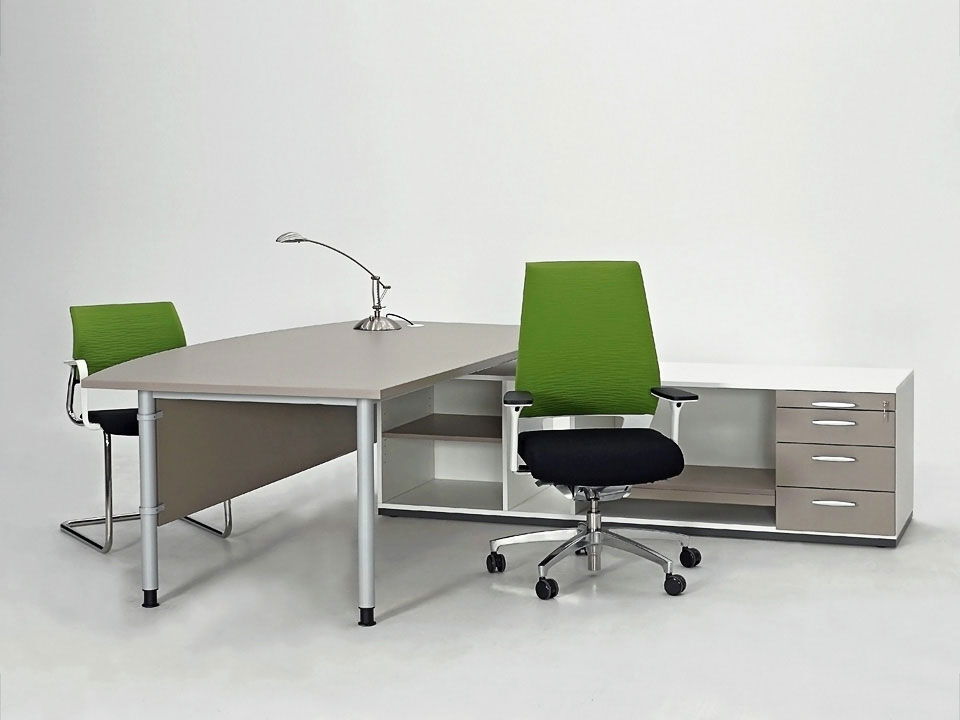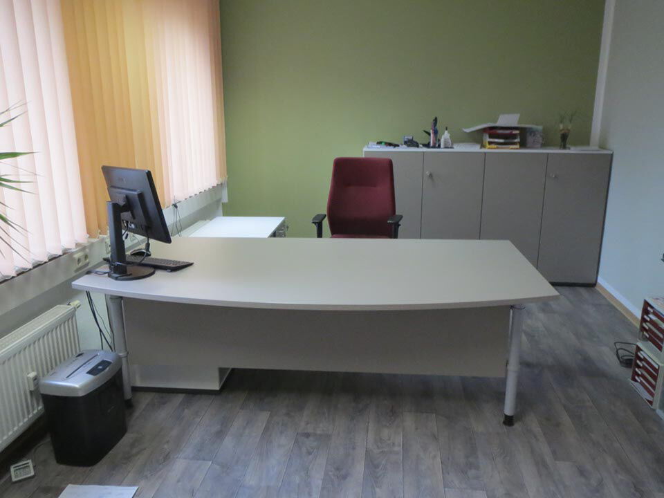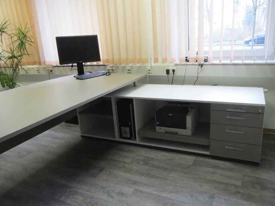 Zeitlose und warme Grautöne bestimmen die Einrichtung des Dienstzimmers und schaffen dadurch eine Wohlfühlatmosphäre. Die Akten- und Medikamentenschränke bieten genug Stauraum ohne den Raum zu erdrücken. Der großzügige Arbeitsplatz lädt durch seine geschwungene Form zu Besprechungen ein. Durch die integrierte Flachstrecke ist die Technik ausgezeichnet untergebracht.